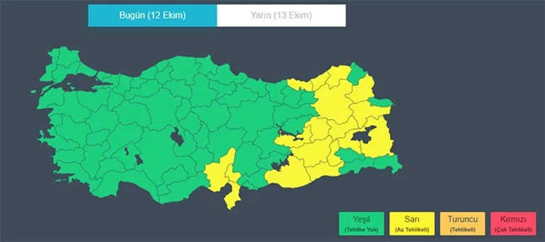 Ağrı, Artvin, Bingöl, Bitlis, Diyarbakır, Elazığ, Erzurum, Kars, Mardin, Muş, Rize, Trabzon, Şanlıurfa, Van ve Batman illeri için ise yarın Sarı kodlu uyarı verildi.